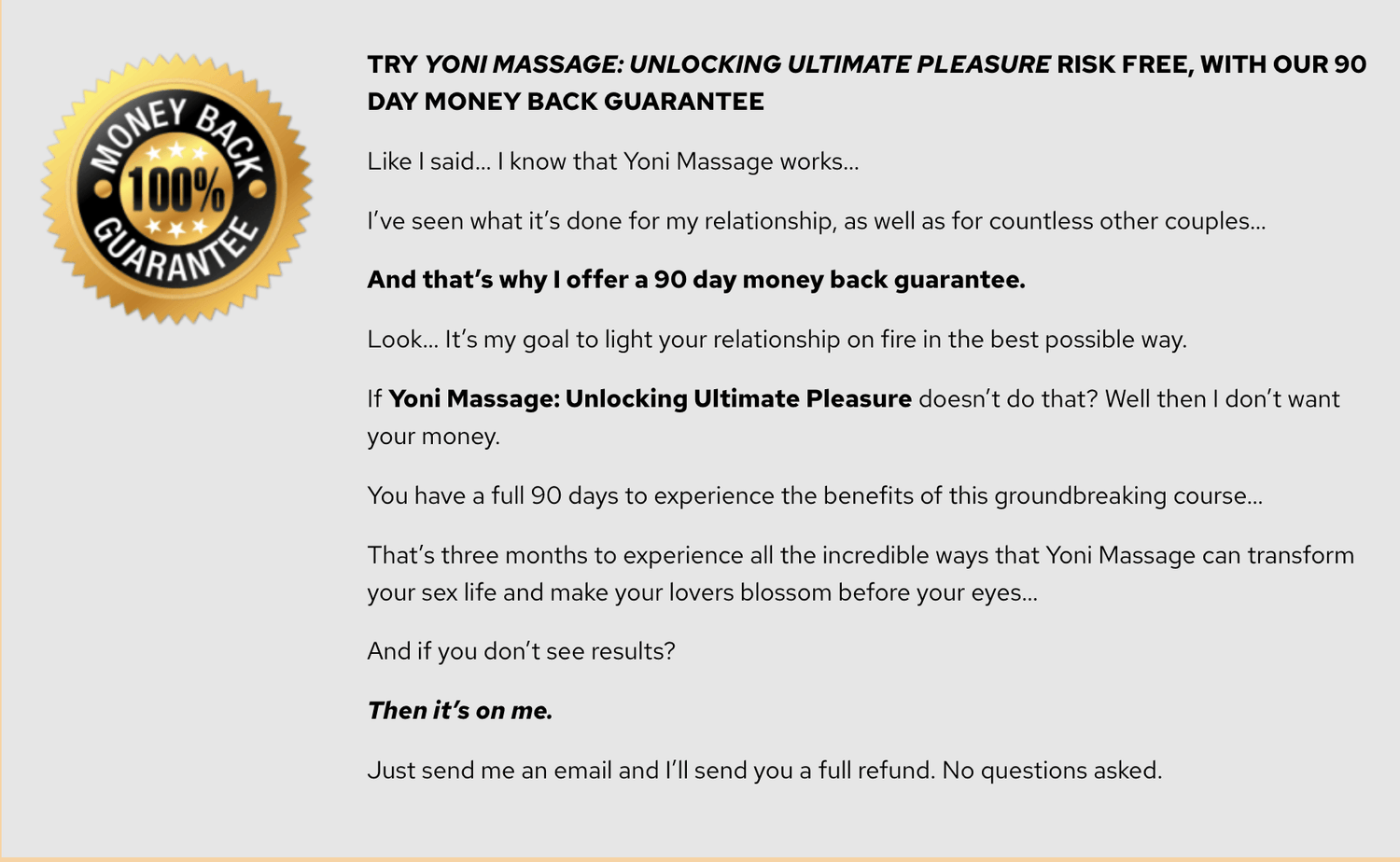 Anything you spend on products will be given back to you up to 5 times!We know that by you sticking to program and using the devices and methods as instructed you can at least achieve great erection quality (effortless penetration with zero signs of poor erection quality), at least double your stamina and increase your size by at least 20% (up to 50%) from your starting size given this is your first attempt at PE methods.We look forward to hearing about your results and rewarding you accordingly from you providing a testimonial that will also help others getting into this training.If you wish to take us up on this offer please email mike@totalmanperformance.com so we can send you a few instructions and what the written, audio or video has to include. The reward will be subject to a quality check making sure that the results are true and the testimonial covers the points we need covered. Example: At least 30 seconds explaining your before situation with one or more of hardness, stamina and size then after, where you are now and how it has changed you and potentially your life. The video can be of you or even just you videoing the product(s) you have of ours and explaining how they helped. If you wanted to do a video of you face on but wanted your face blurred we can edit that for you. We will always send any edits back for your approval first before posting them on our site(s).